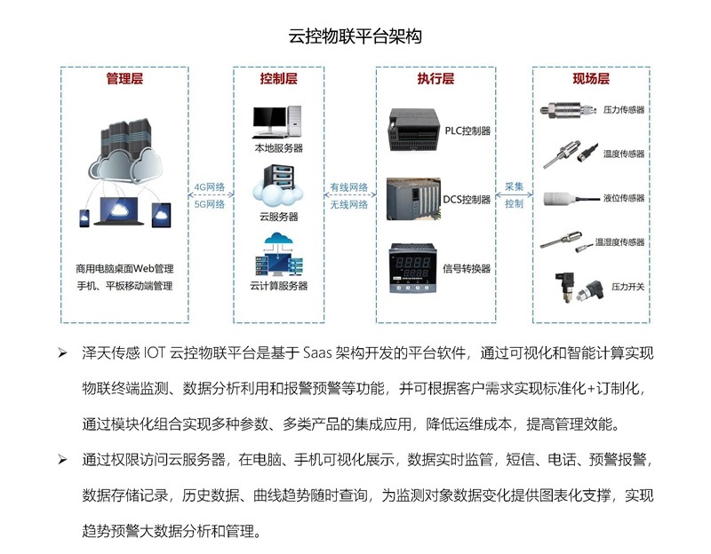 湖南澤天傳感研制的傳感器具有高精度、高靈敏度、高可靠性等特點(diǎn),已廣泛應(yīng)用于工業(yè)控制、工程機(jī)械、化工冶金、能源生產(chǎn)、環(huán)保監(jiān)測(cè)、食品醫(yī)療、航空航天等領(lǐng)域。澤天傳感研發(fā)的新一代智能傳感測(cè)控技術(shù),已正式應(yīng)用在基于物聯(lián)網(wǎng)傳感技術(shù)的云控物聯(lián)解決方案中,本方案設(shè)計(jì)為管控層、執(zhí)行層、現(xiàn)場(chǎng)層三級(jí)架構(gòu),利用物聯(lián)網(wǎng)和互聯(lián)網(wǎng)技術(shù),通過(guò)現(xiàn)場(chǎng)層的高性能傳感器實(shí)時(shí)監(jiān)測(cè)各種物理量,經(jīng)過(guò)控制層利用無(wú)線(xiàn)傳輸技術(shù)將數(shù)據(jù)實(shí)時(shí)傳輸?shù)皆贫?,再利用大量監(jiān)測(cè)數(shù)據(jù)進(jìn)行趨勢(shì)預(yù)測(cè)計(jì)算,實(shí)現(xiàn)多種參數(shù)、多類(lèi)產(chǎn)品的集成應(yīng)用,降低運(yùn)維成本,提高管理效能,為自動(dòng)化控制、智能化生產(chǎn)等提供了有力支持。