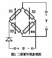 如圖2示:將二極管串接入橋路的供壓電源端來(lái)實(shí)現(xiàn)靈敏度溫漂的補(bǔ)償;其原理是:對(duì)橋路采用恒壓源供電,二極管在正向使用時(shí)相當(dāng)于負(fù)溫度系數(shù)的小電阻,當(dāng)環(huán)境溫度增加,二極管正向電阻值減小,二極管的分壓減小,橋路的供橋電壓增加,使得傳感器的零點(diǎn)輸出與滿量程輸出增加,從而達(dá)到補(bǔ)償硅傳感器的負(fù)靈敏度溫漂。這種方法簡(jiǎn)單實(shí)用,適應(yīng)于硅壓阻式傳感器的靈敏度溫漂補(bǔ)償;缺點(diǎn)是二極管補(bǔ)償方式離散性大,不能實(shí)現(xiàn)連續(xù)補(bǔ)償。